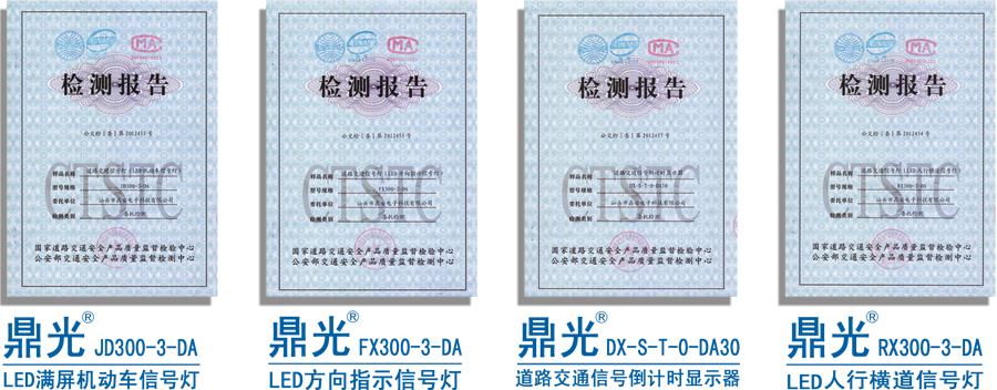 鼎光 交通信號燈符合《GB14887-2011道路交通信號燈》標準,并且通過公安部交通安全產(chǎn)品質(zhì)量監(jiān)督檢 測中心檢測(最新檢測公交檢【委】第2012453-57號),生產(chǎn)、服務通過ISO9001國際質(zhì)量體系認證。